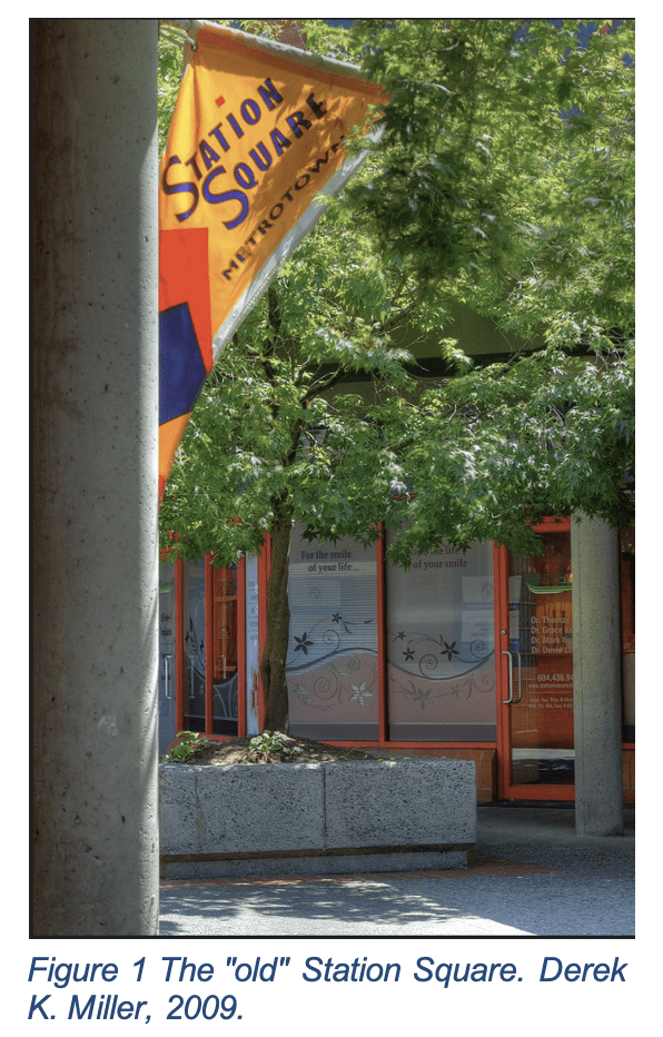 It was originally a shopping and services centre with brick covered walkways and a large parking garage (fig. 1). Infamously before the grand opening, the Save-On-Foods was quickly dubbed “Cave-On Foods”, when the roof collapsed and several cars were destroyed (Naylor, 2019). In 2004 the land was acquired by developers to create today’s Station Square.