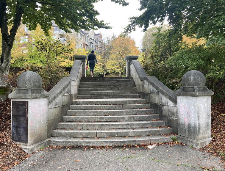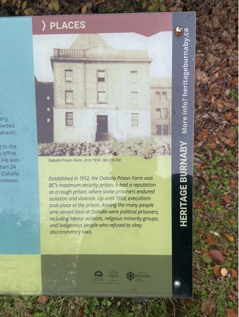 There were no residential schools in Burnaby, but I want to discuss something in the same realm of carcerality and discrimination: the Oakalla Prison Farm. Up a steep slope on the south side of Deer Lake, there used to be a prison complex. Today it is a sprawling area of townhouses and apartments, intersected down the middle by hundreds of stone steps. Many Burnabarians walk around the park paths, and locals like me often walk up the many stairs for a good workout. They lead from the lake marsh area all the way up to a busy street at the top of the hill. Deer Lake Park is a beautiful area which I enjoy so much. I’m glad the city works to keep its biodiversity somewhat managed; you can often see turtles, frogs, and the iconic Great Blue Herons in between the reeds and deciduous trees. It gives a small glimpse into what the landscape may have looked like before contact and development which has taken place in the last couple centuries. Luckily, a good amount of the natural riparian land was preserved and restored from its previous use for farming at the prison. The Oakalla prison is not something you’d see any evidence of, if not for the two plaques next to the original stone stairs from the prison entrance (see images below). Here is a transcription of the older 1992 plaque, which is a very settler-oriented perspective as I will discuss afterwards:
