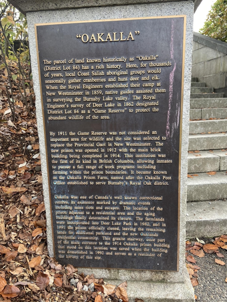 Oakalla was one of Canada’s well known correctional centres, its existence marked by dramatic events including mass riots and escapes The location of the prison adjacent to a residential area and the aging buildings finally determined its closure. The farmlands were incorporated into Deer Lake Park in 1982, and in 1991 the prison officially closed, leaving the remaining lands for additional parkland and the new Oaklands residential community. This granite stairway, once part of the main entrance to the 1914 Oakalla prison building that stood on this location was saved when the building was demolished in 10992 and serves as a reminder of the history of this site”