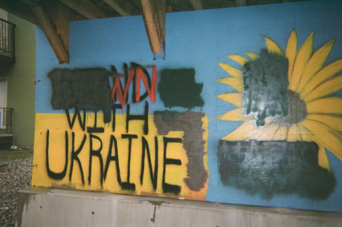 A Metrotown resident painted a mural on a construction site on Wilson street to show love for Ukraine. It was soon defiled with Russian propaganda, then covered up, and now has been re-painted.