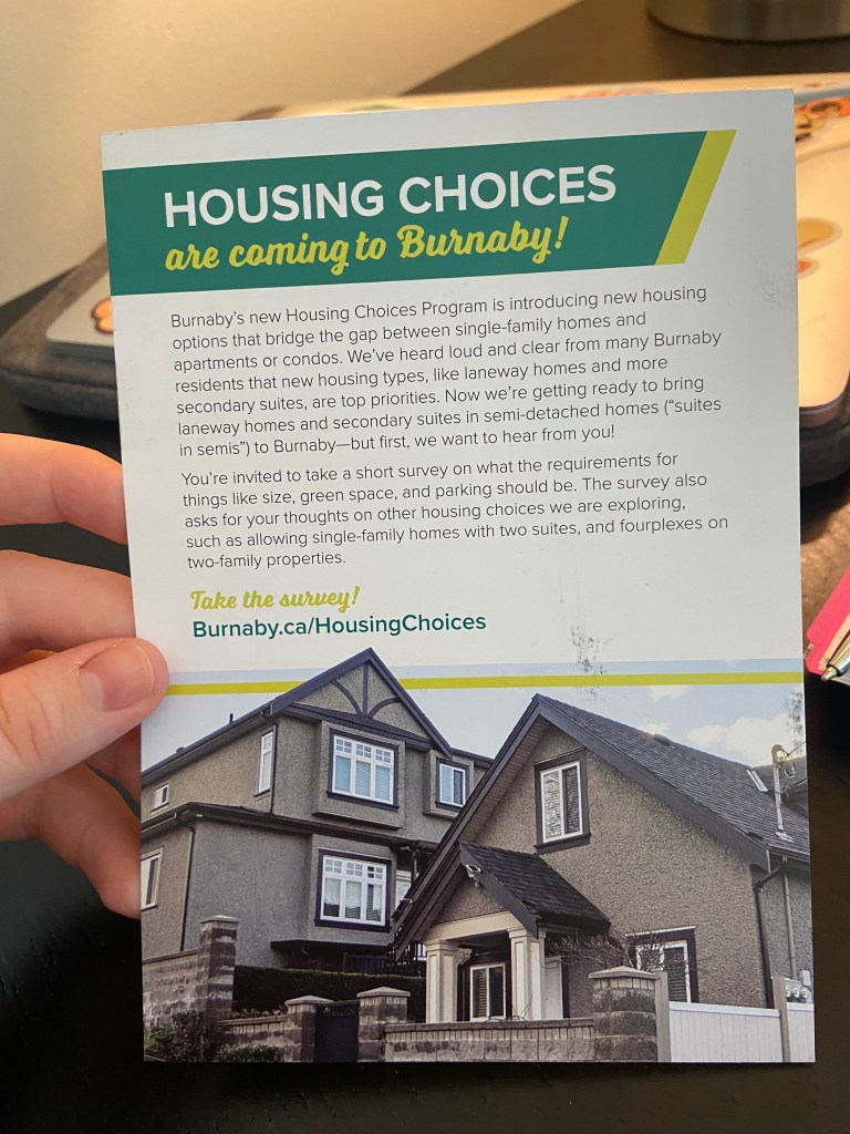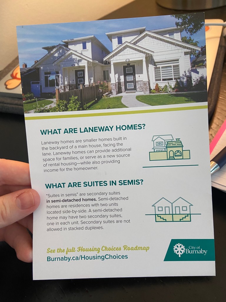 Burnaby is currently trying to fill the missing middle, zoning for and building more multi-unit or alternative housing that fits ‘between’ single family homes and high rises. I got a flyer in the mail the other day advertising a survey on this topic. I am glad to see this moving along, because a thriving neighbourhood should have a mix of housing options.